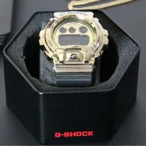 Stylish G-Shock watch. Gold bezel with black strap. Durable and modern design.