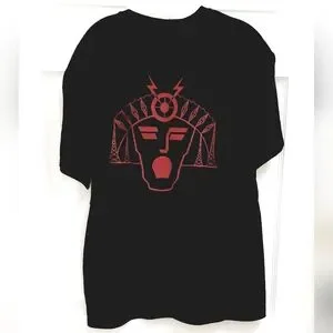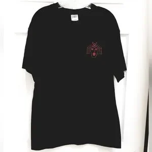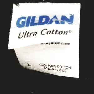 Large logo on back, small logo on front. Excellent preowned condition, no flaws, 100% cotton by Gildan, size Large, black. Company issued, original owner.