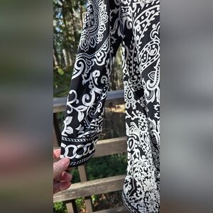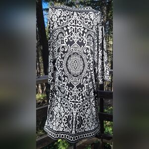 This is an elegant elegant, gently tested with no defects, black and white scroll/paisley patterned tunic/dress that is perfect for any occasion. Features intricate designs and chains for a stylish look. This is very stretchy with a square caller and 3/4" sleeves. This can be dressed up with heels or down with leggings and boots. The approximate unstretched measurements;