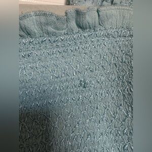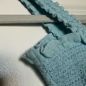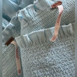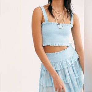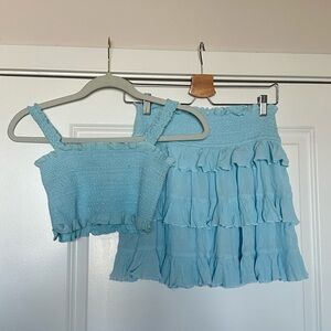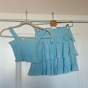 Adorable crop top and skirt set. Top and waistband of skirt are smocked. Stretchy straps. Fits TTS. Surface pull on front of top. Could probably cut off or tuck in those strings are barely notice. Worn and washed once, maybe some slight pilling on arm pits, easy to remove.