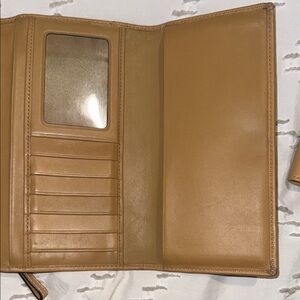 EUC Coach Hampton Trifold Tan Leather Wallet Snap Closure Checkbook Insert Coin zipper pocket. Elegant tan leather wallet with a sleek design.