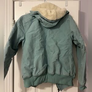 Moderate signs of wear for a work jacket. Notable spot staining at left breast and center bottom back. General faded staining at inner forearm sleeve area. Pilling at outer cuffs. Inside lining and hood in perfect condition. Size small 4-6. Color is coastline, a seafoam teal color.