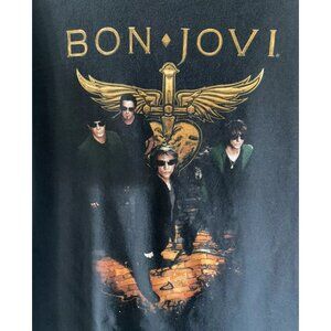 This vintage Bon Jovi 2011 tour t-shirt is a must-have for any true fan! Featuring iconic Bon Jovi graphics, this classic black tee is perfect for rocking out at concerts, casual wear, or adding to your vintage band tee collection.