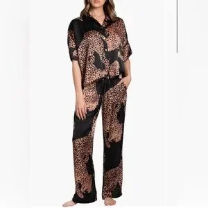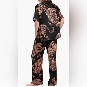 Drift off to dreamland or lounge in the comfort of these fluid satin pajamas covered in a fierce pattern.