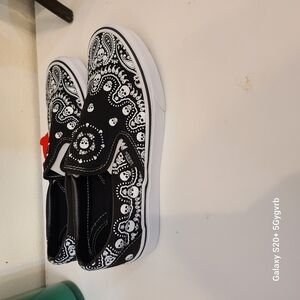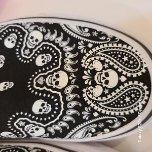 Stylish Vans slip-on sneakers with a black and white skull pattern. Perfect for casual wear.