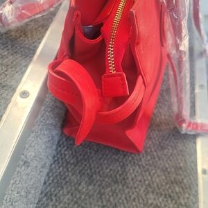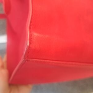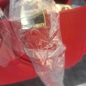 It still has the plastic on the closures and handles. It has a little discoloration on 2 of the 4 corners, not from use, just from hanging in my closet. I accept reasonable offers.