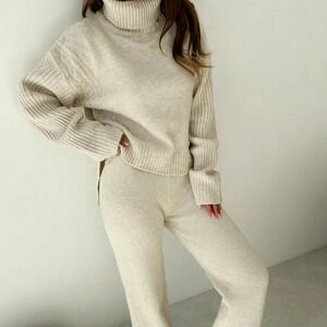 Grey Casual Women's Loose Fit High Neck Oversized Sweater Set