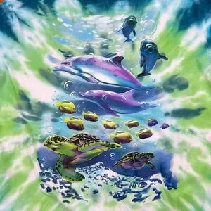 Turquoise, green and white spiral tie dye shirt with thick dolphin and turtles graphic.