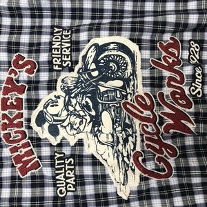 Discover unique style with this Mickey Motorcycle shirt. Featuring a plaid pattern, pearl snap buttons, short sleeves, this shirt is both casual and stylish. The patch details on the two chest pockets add a playful touch to the design.