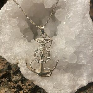 Sterling Silver Mariner’s Jesus Christ Crucifix. Retail 268.00 NWT. Elegant silver anchor pendant necklace, perfect for adding a nautical touch to any outfit. Stamped 925. This mariner’s cross has Jesus Christ on the cross, the anchor and ships wheel. Finely detailed. Comes on your choice length Sterling Silver box chain in 16”, 18” or 20”. Please comment desi chain length when purchasing. Gift boxed as shown. Unisex. I ship mostly same day. Thanks for looking.