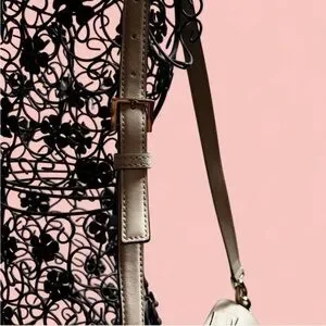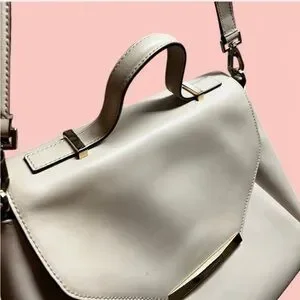 This elegant satchel features a structured design with a prominent flap closure, crafted from textured leather in a sophisticated off-white hue. It includes a top handle for hand-carrying and an adjustable, detachable strap for versatile wear. Silver-toned hardware adds a touch of modern elegance to this timeless handbag