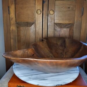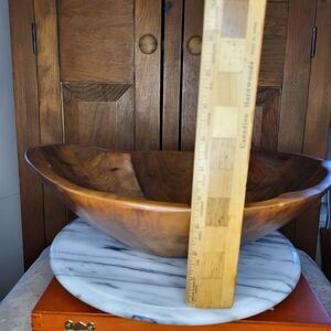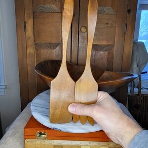 Enhance your home decor with this Vintage Thompson elegant wooden bowl set. The rich brown color adds warmth and sophistication to any space. Includes Bowl and Pair of Utensils. No chips or cracks and is in excellent original condition. $75.