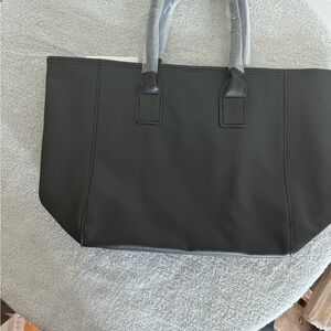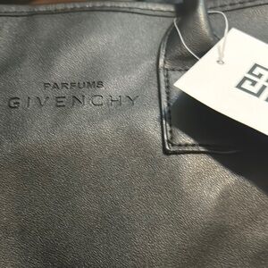 GIVENCHY PARFUMS TOTE BAG. ~ DOUBLE HANDLE ~ BLACK FAUX LEATHER ~. 13 3/4" TALL x 13 1/2" WIDE x 4" DEPTH ~ SNAP CLOSURE ~. Chic faux black leather tote by Givenchy. Features durable handles and a minimalist design.