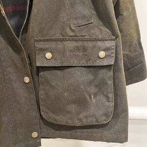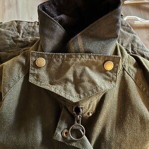 Barbour jacket in the “Acorn” style. It’s in great condition, worn a handful of times. There’s a little white scoffing on one of the pockets. This jacket also shows the natural discoloration of Barbour/waxed jackets that occur over time. If you want it to look 100% brand new you can take it into any Barbour shop or a shop that is a certified seller of Barbour jackets and get it re-waxed. I purchased the detachable hat separately ($50.00) but am selling with the jacket. The colors match perfectly! I’m selling it bc I just don’t reach for it enough.