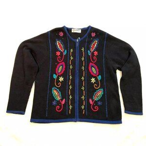 Vtg Black Cardigan Sweater Size L Embroidered Flowers Full Zip Heavy Duty Womens