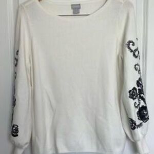 NWT- Chico’s- Cream Sweater with Black Embroidery/sequins on sleeves