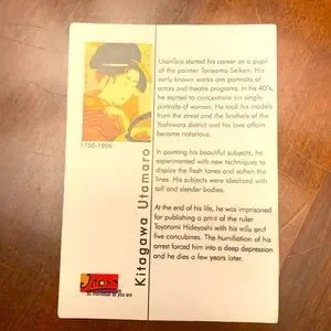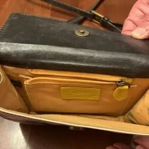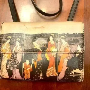 Black leather with beige interior. Body 7” wide, 5” deep, 1.5” across bottom. Beautiful imagery by Kitaisha UTAMARO. Bohemian. Artsy. Unique. Original card explaining his art and this purse is included. 48” strap. Wallet organiser for credit cards and ID. Inside zippered pocket.