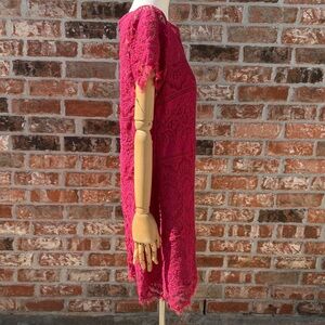 A pretty red lace dress in a size 8 by Free People. Cutout is on the neck and back and is sheer lace panels. Dress is more of a cranberry than a bright red like the stock photo.
