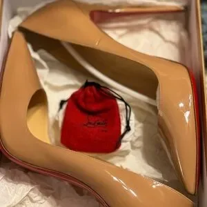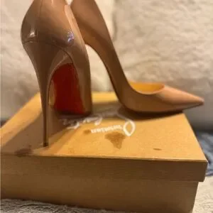Experience the allure of Christian Louboutin with these beautiful patent leather nude stiletto heels, featuring a signature red sole and a sleek pointed toe design. Crafted from glossy material, these So Kate’s offer a sophisticated and timeless appeal that is SO needed in every girls closet! These heels are versatile and timeless. I’ve worn them in the past with everything from skinny jeans to a tailored suit to a formal gown. Unfortunately, THIS girl needs to let them go to a new home.