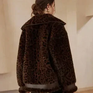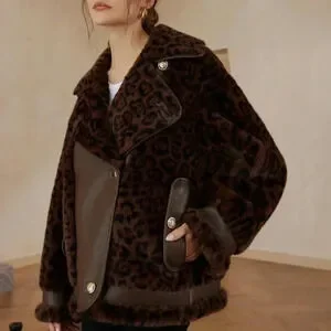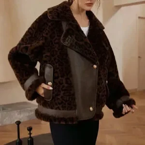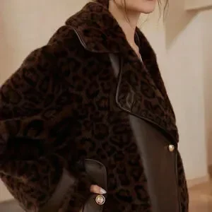Brown Casual Women's Leopard Print Patchwork Fluffy Faux Leather Aviator Jacket