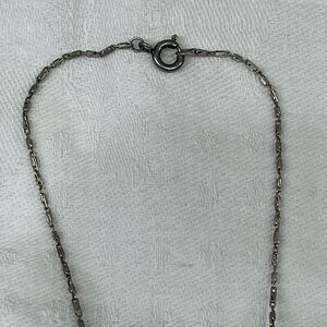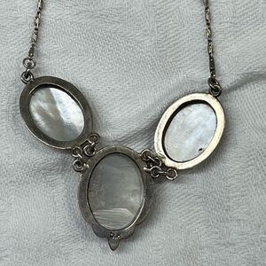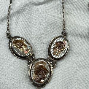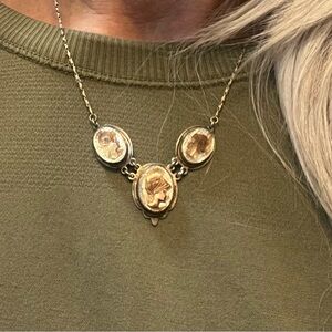 The necklace has three (3) cameos and a delicate silver chain with a locking circular clasp. The bottom-most cameo is larger than the two above it.