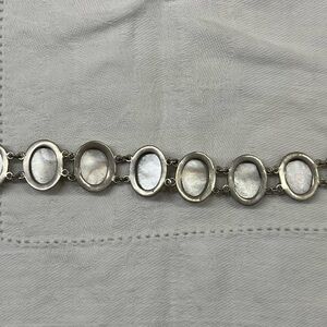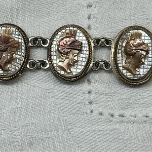 The bracelet has 10 cameos, all the same size, and a push-in locking mechanism to keep it secure. Push in the loop-type pin, & it will unlock.