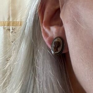 The earrings appear to be mismatched but they complete this set. I note the earrings have different twisting mechanisms but both work. And one carved head is slightly larger although the cameos are the same size.