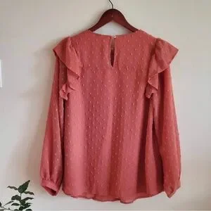 Beautiful flowy embroidered top in a sheer Swiss dot fabric that is fully lined. The top has ruffles at the shoulders, key hole button closure in back and banded sleeves. Bust measures 19” across. Excellent preowned condition.