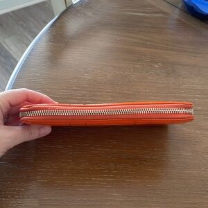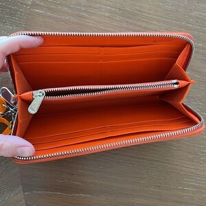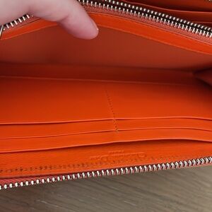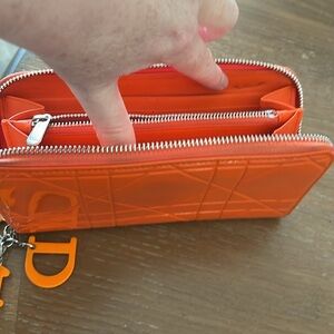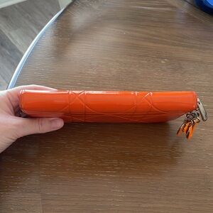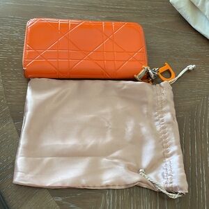 Stylish Dior wallet in vibrant orange patent leather. Features iconic quilted design and Dior charm.
