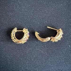 Genuine 14K & multi gemstone EUC hinged huggie hoop earrings.