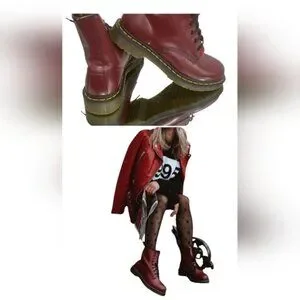 Stylish red leather boots by Dr. Martens. Features durable soles and classic design.
