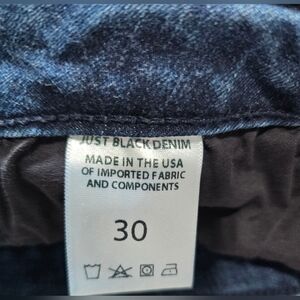 JustBlack Womens Flared High-Rise Jeans with Manufacturers Distressed Marks. Finished with an edgy scissor cut raw hem. It features a zipper fly, 5 pocket styling, and belt loops. Color may vary due to camera lighting. Normal wear throughout, great condition! Jeans state size 30.