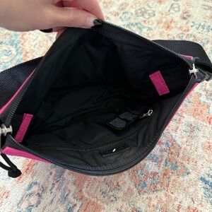 This is an authentic BALENCIAGA Recycled Sport Nylon Logo Embroidered Wheel Sling Bag in Fluo Pink and Black. The bag is crafted of pink nylon fabric with a black Balenciaga logo on the front. The bag features a black adjustable shoulder strap and black hardware. The top zipper opens to a black nylon fabric interior with a zipper pocket.