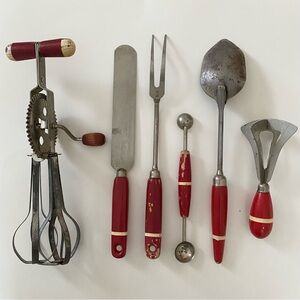 Six wonderfully shabby, chippy, rusty vintage red with yellow stripe wood handle utensils.