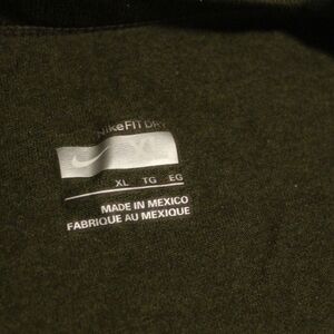 Men's Nike Dry Fit short-sleeved pullover shirt in olive green, size XL (extra-large). Made from 100% polyester, it's lightweight and moisture-wicking for comfort. The shirt is manufactured in Mexico and has the tags RN 56323 and CA 05553. Perfect for athletic wear or casual use.
