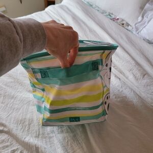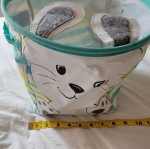 Thirty One brand mini storage tote in Easter bunny theme with blue and yellow festive stripes. Some small scuffs on outside. Metal support is not perfectly round. Gently used for Easter basket. Grey and white floppy ears. Approximately 9.5 inches by 8 inches. Cute storage basket with 2 handles. Easter basket or toy tote. Organizer for small items or art supplies.