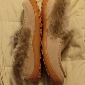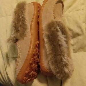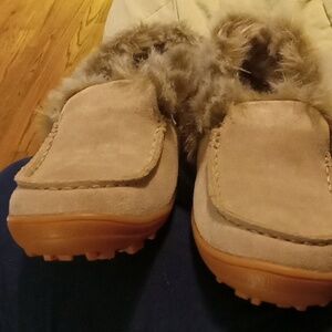 tan with orangish plastic bottom and brown/tan/grey faux fur in good condition size 7