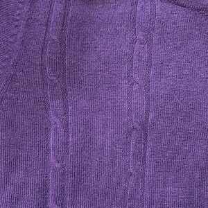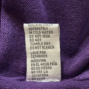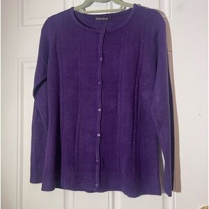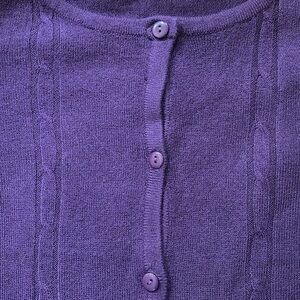 This pretty classic cardigan is a deep purple color with buttons down the front and crew neck. Fabric is a very soft 100% acrylic and machine washable. Sweater has ribbing on bottom and bottom of sleeves. Measurements are length 25.5 and pit to pit 20”.