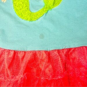 Rare Editions 24 month or 2T pink and blue sleeveless mermaid dress with sparkle ruffle tutu, sequins, bow with jewel, and button closure on the back. There is one small stain that could possibly be treated as seen in photos.