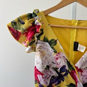 Features/Accents: Ruffle Cap Sleeve, Stretch, Fitted, Midi Length, Pencil Dress, Figure Hugging, Multi Color Flowers, Bright Yellow Dress