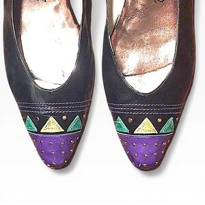 MARGARET JERROLD Vintage black pumps with Red Green Gold Accents & Gold Studs 9