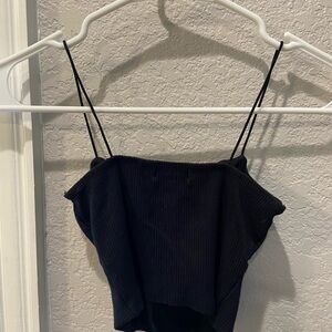 Urban Outfitters black cannon ribbed tank crop top. Thin spaghetti straps, stretchy, versatile, staple, flirty, summer, beach, earthy. Small area shown where seen is slightly unraveled from inside as shown.