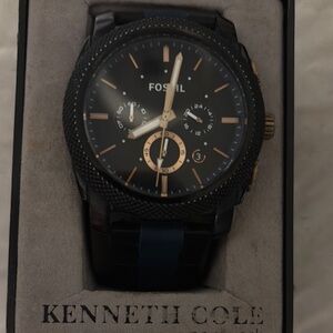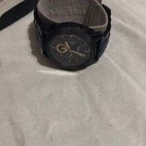 Stylish Fossil watch with a black dial. Gold accents enhance the design. Perfect for any occasion.