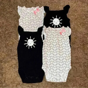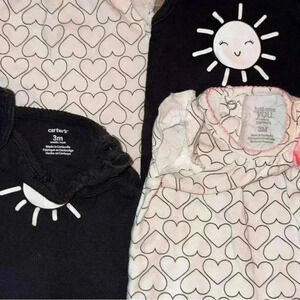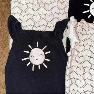 Adorable Carter’s 3M bodysuit bundle, perfect for twin baby girls. Includes two white heart-print bodysuits with pink bows and two black bodysuits with a happy sun graphic. A sweet and coordinated set for your little ones.