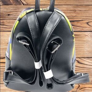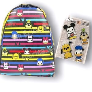 Multicolored stripes with Mickey, Minnie, Donald, goofy, Pluto, & Daisy's Funko Pop heads! Vegan leather with a large zippered opening! Bigger than most Loungefly bags openings. 2 slip pockets inside. Adjustable straps.
