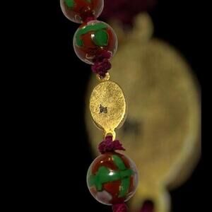 This antique Chinese Export cloisonné necklace features large beads with a striking red enamel floral design, reflecting the Art Deco era style from the 1930s. The necklace is handmade with yellow gold plated brass and has a length of 12 inches, making it a statement piece with ethnic beauty and artistry. The vintage piece showcases traditional Chinese craftsmanship and intricate detailing, perfect for adding a pop of color and cultural flair to any outfit.