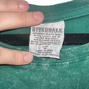 Women’s green Riverdale “South Side Serpents” Long Sleeve Shirt. Shirt has white writing on the back and the south side serpent logo on the front. Material is 100% cotton. Fabric is loose and has some stretch to it.