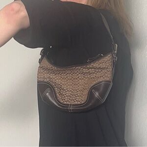 Coach Hobo bag with signature print, brown leather strap and trim, silver hardware accents. Excellent condition. 10” x 6” dimensions