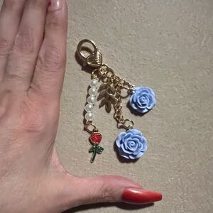 New Blue Camellia, Faux Pearl, & Red Rose Resin Keychain/Bag Charm