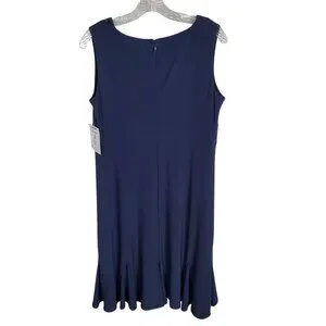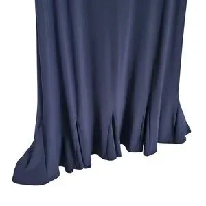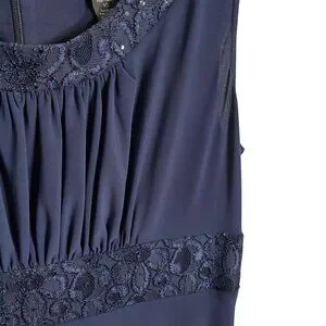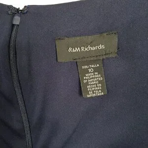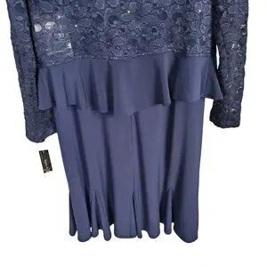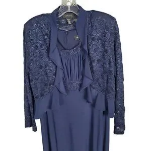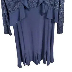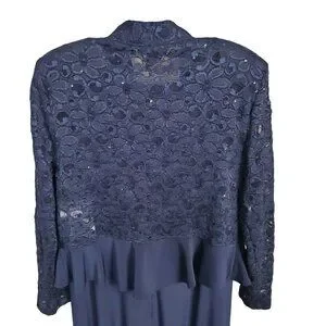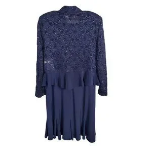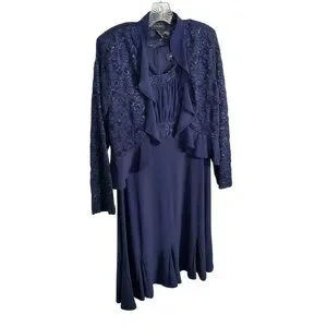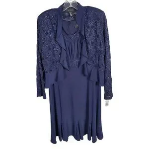 This is an R&M Richards navy blue dress and jacket set. The dress features a ruffled front and a midi length, while the jacket is made of lace and embellished with sequins. R&M Richards specializes in dresses for special occasions, including mother-of-the-bride dresses, cocktail dresses, and formal dresses.